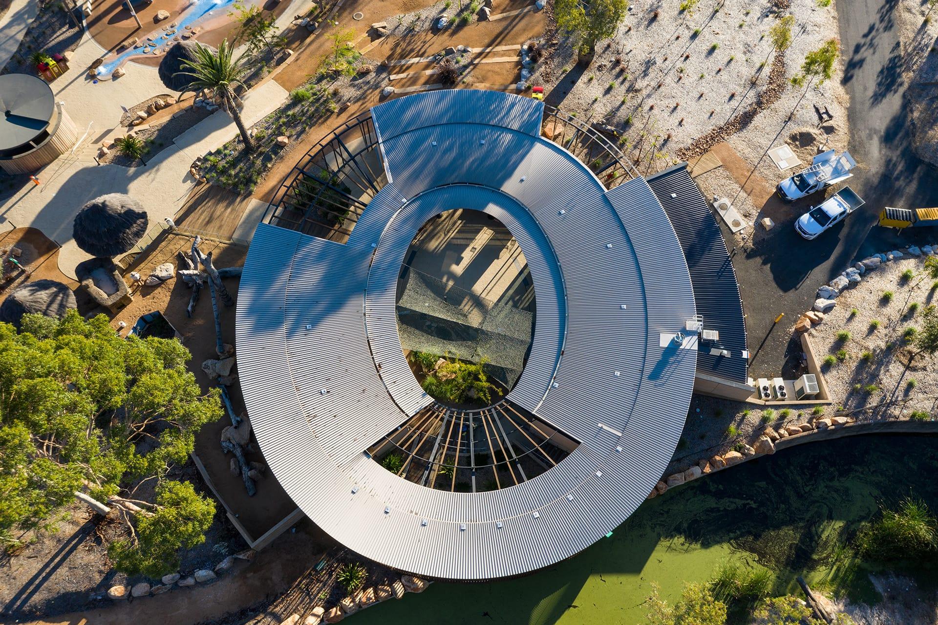 The Waterhole Cafe at Taronga Western Plains Zoo, designed by Jackson Teece Architects, redefines the visitor experience with its innovative design. Located at the zoo’s midpoint, the cafe features an elliptical shape with a central oculus and seating for 150 people. Chosen for its ability to be tapered thereby accommodating the challenging roof geometry, LYSAGHT LONGLINE 305® roofing is key to the cafe’s modern aesthetic. This award-winning project integrates seamlessly with the zoo’s environment, offering stunning views and a memorable dining experience. Completed by David Payne Constructions, the cafe has quickly become a destination in its own right, attracting both locals and tourists.