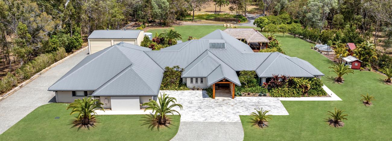 Image Alt Tag: Expansive rural property with multiple rooflines in COLORBOND® steel Basalt®, surrounded by lush greenery.