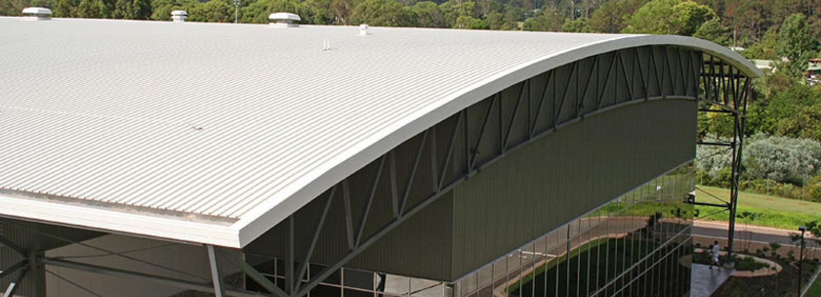 The continuous sheets of roof cladding span 53.1 metres from eave to eave over a truss system in which the bottom chord is post tensioned to eliminate the need for support columns. BlueScope Lysaght rollformed the cladding on site, directly to the roof.