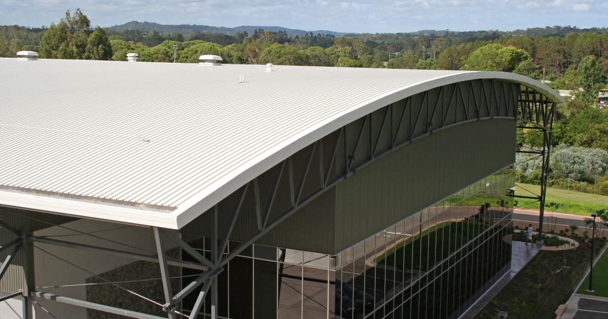 The continuous sheets of roof cladding span 53.1 metres from eave to eave over a truss system in which the bottom chord is post tensioned to eliminate the need for support columns. BlueScope Lysaght rollformed the cladding on site, directly to the roof.