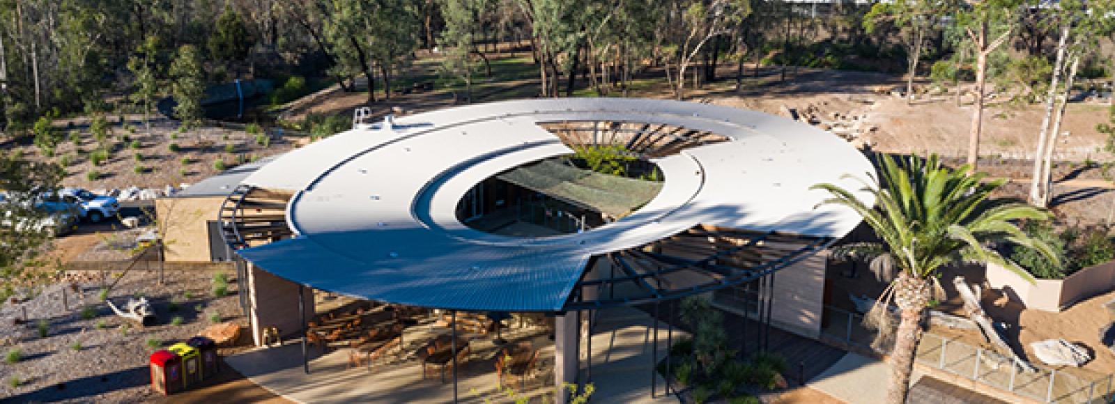 The Waterhole Café is located at the Taronga Western Plains Zoo and is a popular meeting place for zoo visitors to recharge with a snack or meal. Jackson Teece Architects was commissioned to replace existing infrastructure on site with a new building. The resultant design conforms with the natural environment while still being visually striking and dynamic, and providing a functional space where patrons can relax, taking in 360° views of their surroundings. A standout of the build is the innovative use of LYSAGHT LONGLINE 305® in a circular application.
