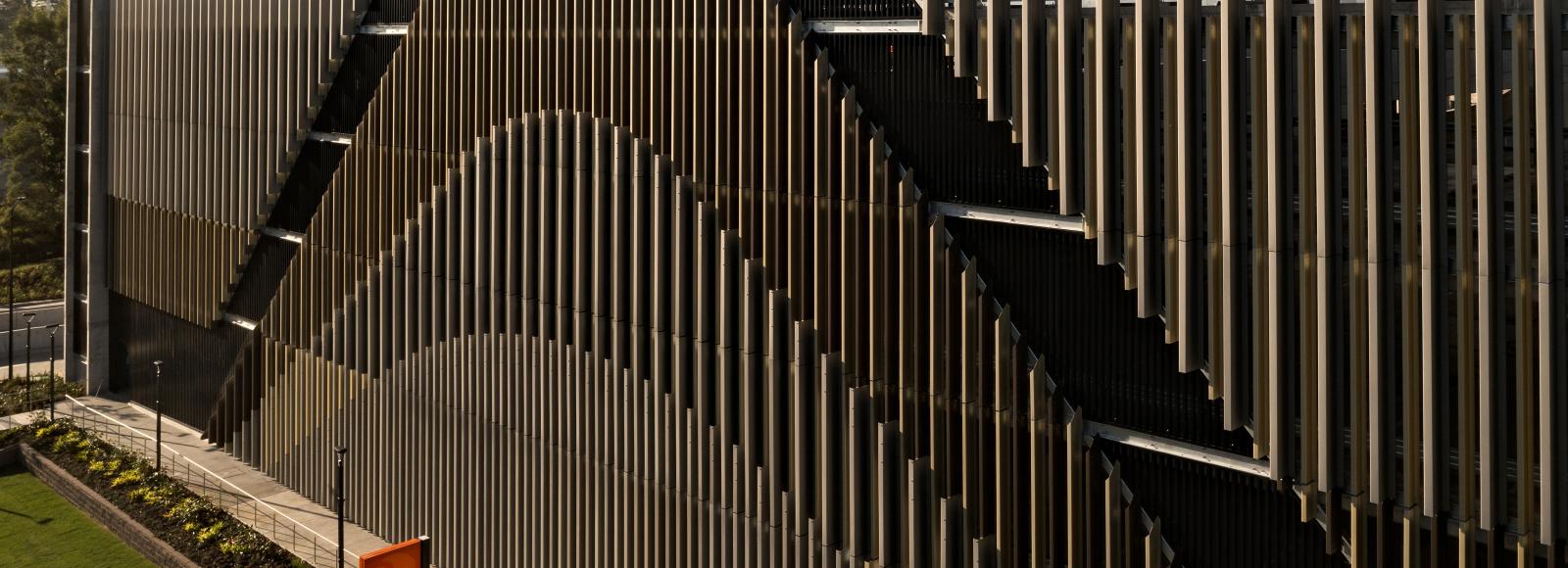 The new Springfield Central Station Multi Storey Park ‘n’ Ride is a four storey $55M development, which has used 50 tonnes of this building material, but rather than holding up the roof, these lightweight aluminium purlins have been applied as a design feature, to deliver a vertical vein facade on all three sides of this triangular-shaped building.