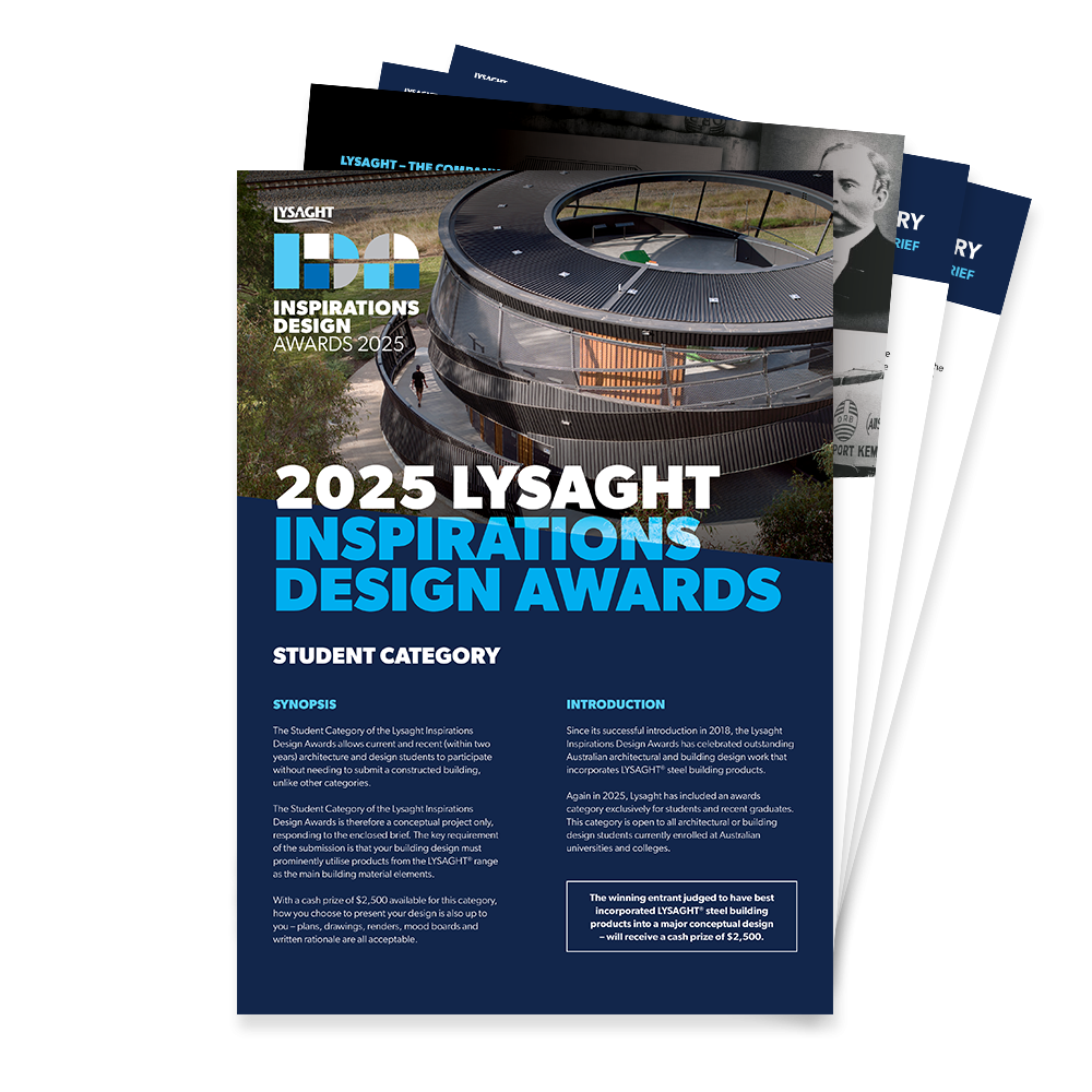 The Student Category of the Lysaght Inspirations Design Awards is therefore a conceptual project only, responding to the enclosed brief. The key requirement of the submission is that your building design must prominently utilise products from the LYSAGHT® range as the main building material elements.