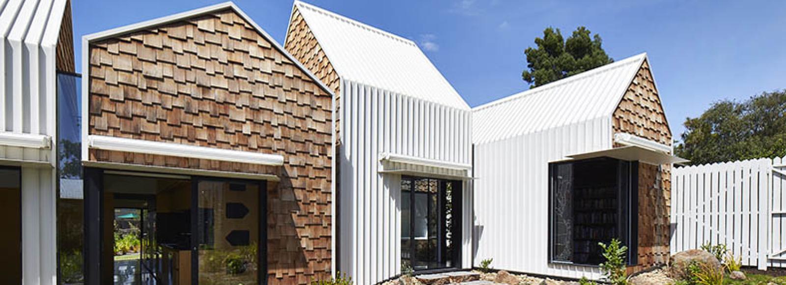 The LONGLINE 305® cladding, with its slender, high ribs and broad, flat pans proved the perfect fit for these striking structures. Its smooth, machine-made lines contrast effectively with the less uniform, hand-installed shingles; while the Surfmist® colour of the COLORBOND® steel, which is reminiscent of pure white sand or the sails of a yacht, brightens the entire residence.