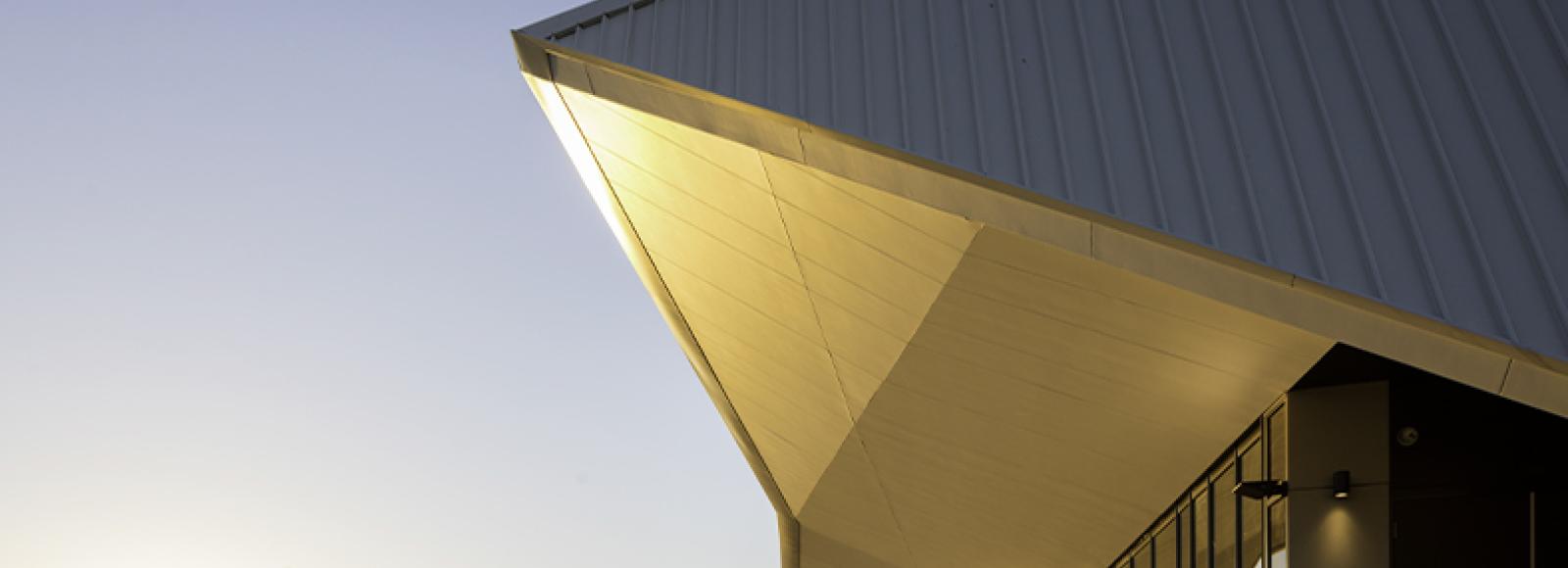 Here, the long straight lines of LYSAGHT KLIP-LOK 700 HI-STRENGTH® roofing are key. Crisp and clean, they are uninterrupted by piercings or connections and therefore open up the roof’s geometric possibilities. They make the structure’s defining features – its folded planes and ‘wing’ that goes tantalisingly close to, but never touches the ground – possible.
